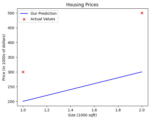 With the perfect parameters, we can predict the price of a house based on its size. Let's say it is 1.2 in size (1000 sqft).